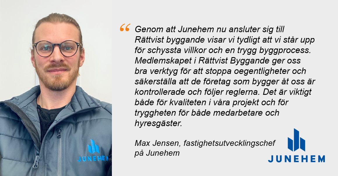 Rättvist byggande Aktuellt 2026 Junehem ny medlem ”Vi är glada över att välkomna vår första medlem i Småland. Från och med nu finns vi även i Jönköping och ser fram emot att både lära oss av och påverka marknaden där till det bättre.” Morgan Jansson, verkställande chef för Rättvist byggande Läs mer om Junehem ABSe samtliga medlemmar i Rättvist byggande