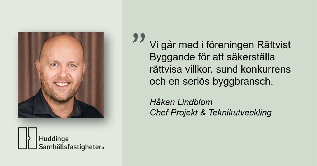 Rättvist byggande Aktuellt 2026 Huddinge Samhällsfastigheter ny medlem ”Vi är glada att ytterligare stärka vår position i Huddinge, där vi sett ett stort behov av vårt arbete.”Morgan Jansson, verkställande chef för Rättvist byggande Läs mer om Huddinge SamhällsfastigheterSe samtliga medlemmar i Rättvist byggande